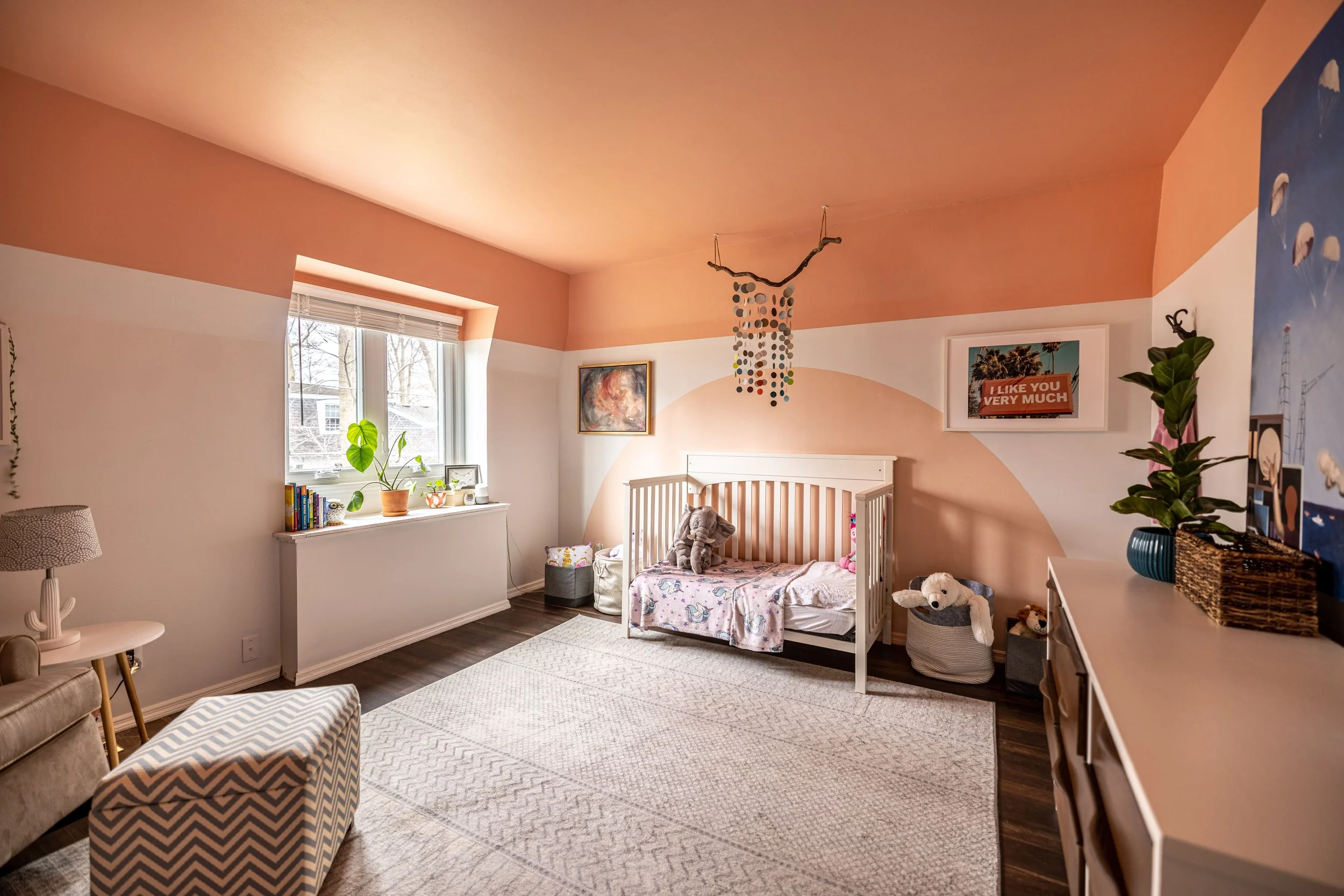 After nearly three years of living in this house, our younger daughter’s room finally got a makeover! I loved getting the chance to try out a new design concept in this space and I’m really happy with how her “dipped” room turned out. It’s so much brighter and more cheerful from where it started!