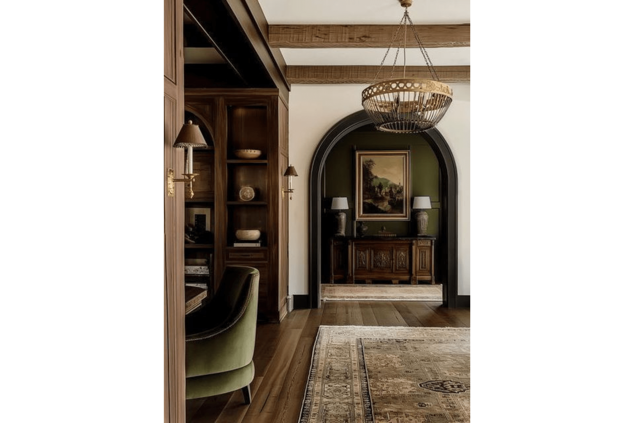 Think framed openings, built-ins, ceiling beams, or even subtle shifts in floor height. These create definition without closing off the space, and give you the flexibility to only color drench one area at a time. Bonus: these tricks also support that traditional moody home style you love.